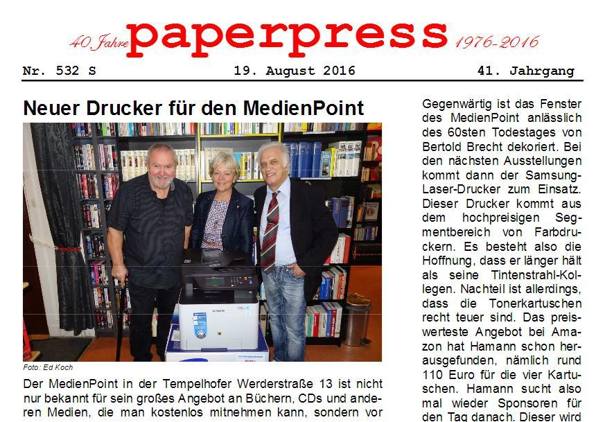 Matthias Steuckardt gespendet. Nun war es aber wieder soweit: Der "MedienPoint" benötigte einen neuen Drucker. Da die Arbeit und Vielfalt solcher Kultureinrichtungen Bildungs- und Kulturstadträtin
